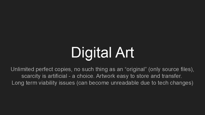 可以无限次地完美复制,没有所谓的“原件”(只存在源文件),稀缺性是人为的可选项。艺术品的存储和转移都较容易。
