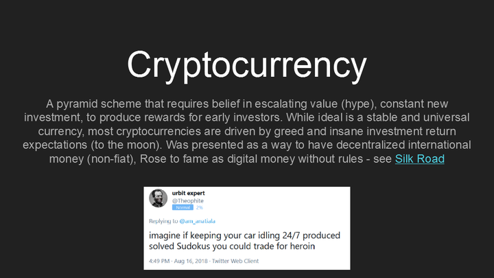 一种基于增值信心的金字塔计划(噱头),持续的新投资为早期投资者带来回报。虽然其愿景是一种稳定的通用货币,但大多数加密货币是由贪婪而疯狂的投资回报预期(“飞向月球”)驱动的。加密货币被作为一种实现去中心化的国际货币(区别于法币)的方法被提出,但其名声却建立在没有规则的数字货币上——见丝绸之路