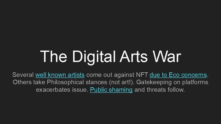 一些知名的艺术家出于对环境的担忧而站出来反对NFT。另一些人则持有哲学上的立场(不是艺术!)。平台上的准入机制使问题更加严重。公开的羞辱和威胁也随之而来。