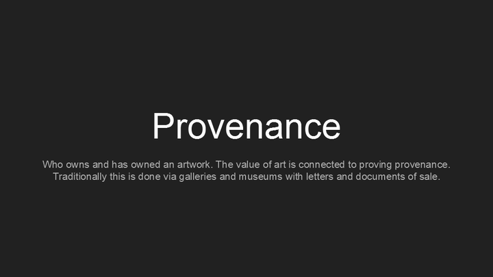 谁拥有和曾经拥有一件艺术品。艺术品的价值与证明来源有关。传统上对来源的证明是通过画廊和博物馆的信件和销售文档完成的。