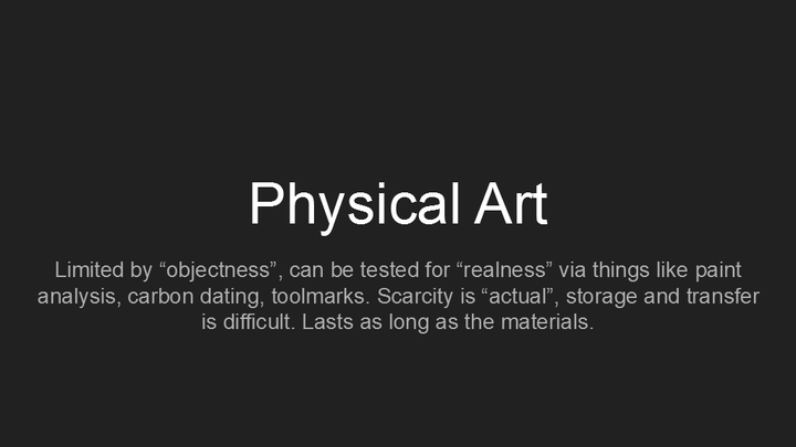 受 “实体性”的限制,可以通过油漆分析、碳测年、工具印记等来检测其 “真实性”。稀缺性是 “实在的”,储存和转移较为困难。其寿命取决于所用的材料。
