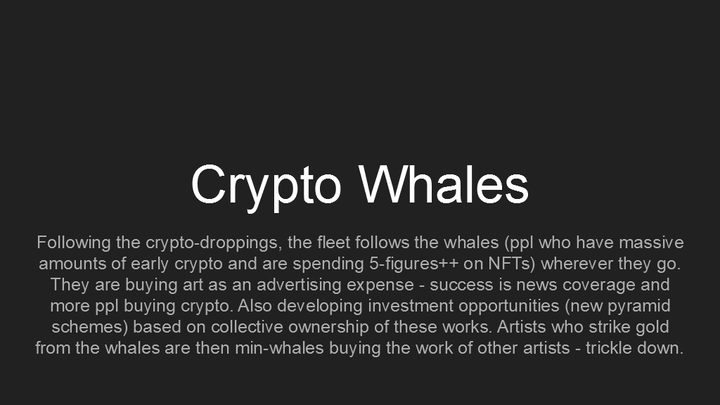 在加密资产发售后,“舰队”会紧随“巨鲸”(指拥有大量早期加密货币并在NFT上花费5位数以上的人)而来。“舰队”购买艺术品的花费会成为广告费——成功的结果是更多的新闻报道以及吸引更多人购买加密货币。同时他们会在这些作品的所有权的基础上开发投资机会(新的金字塔结构)。从“巨鲸”那里淘金成功的艺术家会变成“幼鲸”并收购其他艺术家的作品——环环相扣。
