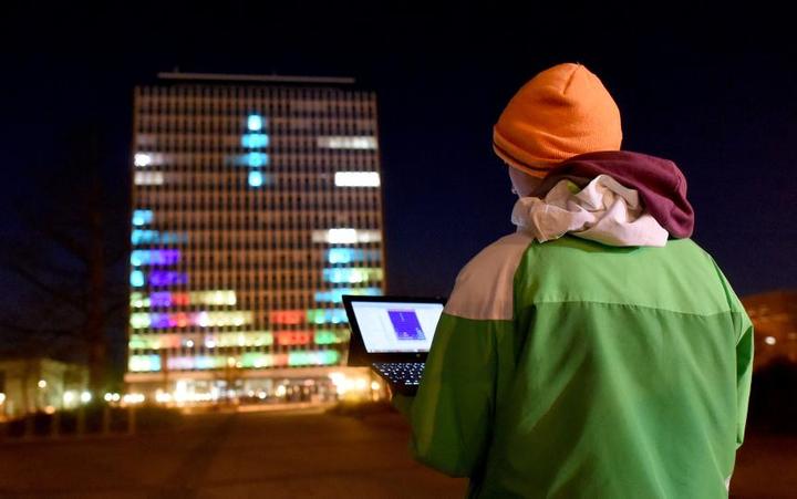 而2016年版本大会上,爱好者们带来了他们更具野心的项目《灯塔》(Lightinghouse),使用57000颗LED灯管将基尔大学(University of Kiel)一栋14层办公楼上的144只窗户变成一只巨大的显示器。