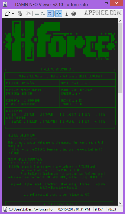 由著名破解组织X-force所制作的Sybase SQL Server注册机的NFO文件。由于字符集的关系,在中文环境下打开NFO文件往往会出现乱码,只有利用类似DAMN NFO Viewer这样的工具才能完整复原这些NFO文件的原貌。