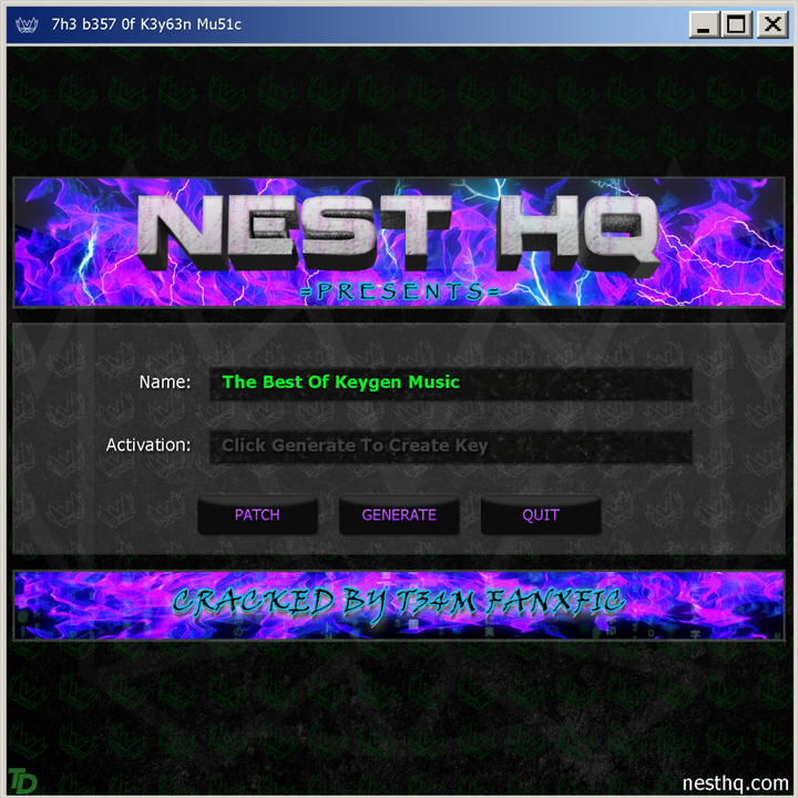 网络音乐厂牌Nest HQ推出了名为《注册机音乐精选》(The best of keygen music)的音乐专辑,收录了90年代初至今的诸多注册机音乐。其专辑封面,展示了大多数注册机所采用的设计元素——充满神秘感的深色配色和五彩斑斓的插图画面。而这正是Demo中所常用的视觉效果。