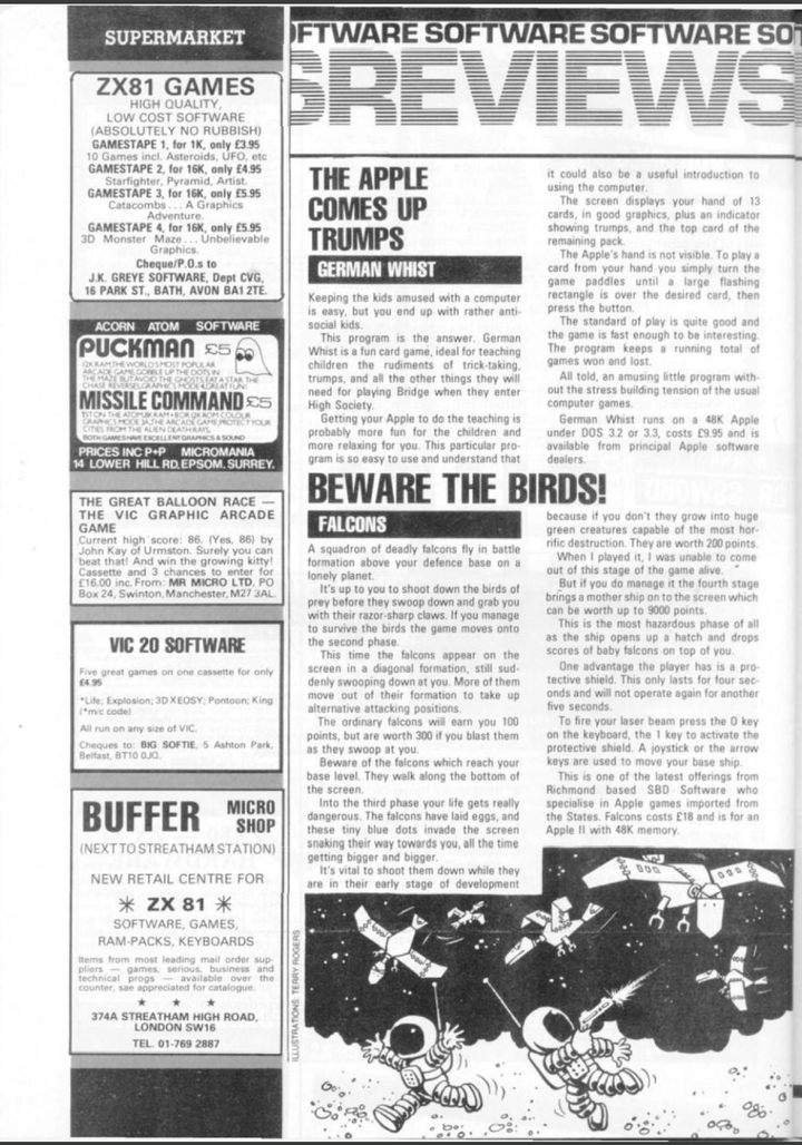 1982年,英国最早的电脑游戏杂志《电脑与电子游戏》(Computer and Video Games,简称“CVG”)上刊登的游戏广告,早期的电脑游戏市场中“山寨”街机游戏是许多爱好者参与游戏开发的起点,如图中的PUCKMAN为PACMAN的早前版本,为防止PUCK被流传为F字眼的词汇改为现名PACMAN。