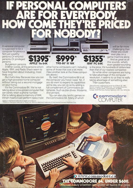 1983年的Commodore 64广告,不仅展示了比其他电脑品牌低得多的价格,同时还展示了其运行《太阳系图解》(Visible Solar System)教育软件的画面,对于当时的家用电脑来讲,教育市场可以说是兵家必争之地,这也启发了后来中国市场上学习机的开发者们。
