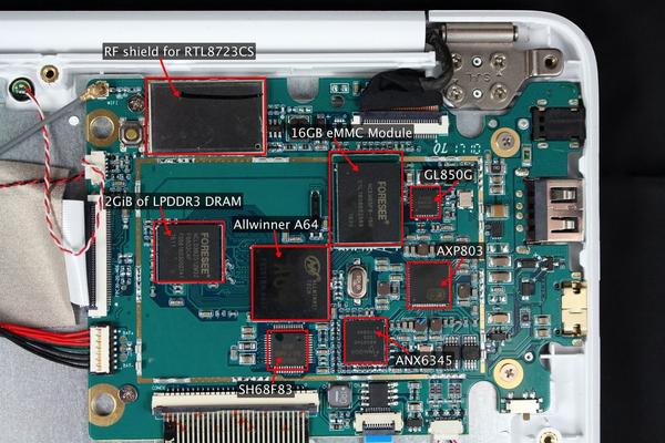 拆掉屏蔽罩后,就可以在电路板中间看到全志(Allwinner)A64处理器,在它的正下方是一颗中颖(Sino Wealth)SH68F83低速USB微控制器,它是笔记本上键盘、鼠标的桥接芯片。在A64处理器的左侧是一颗江波龙(Foresee)NCLD3B2512M32,它是一颗2GB,533Mhz的LPDDR3内存芯片。