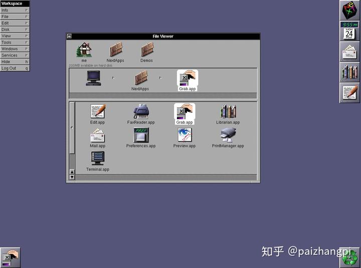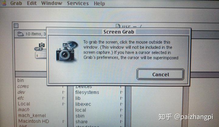 如果你正在运行macOS High Sierra,你可以打开「应用程序」——「实用工具」,然后打开「抓图」。弹出窗口中的那个略显苍老的相机和那个会动的「眼睛」,就是一处NeXT的遗迹。但非常可惜地,随着苹果在macOS Mojave上改进截图工具,旧版Grab.app被全新的Grab.app代替了。