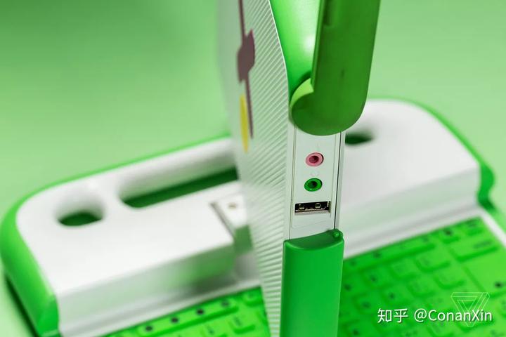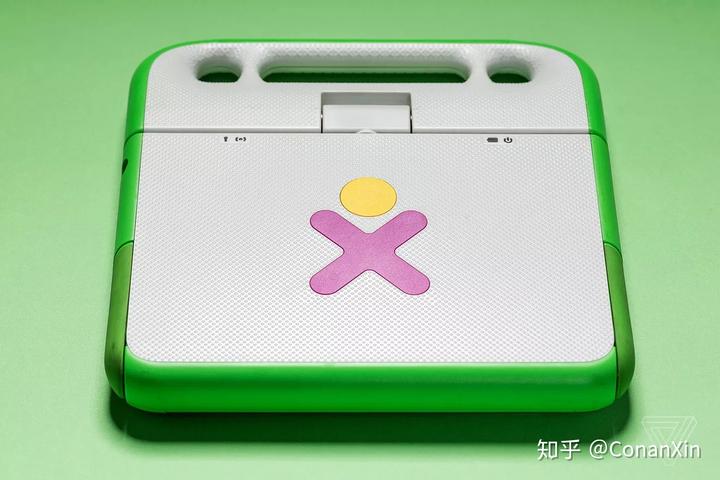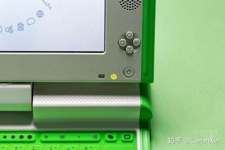 其结果是一款与众不同名为XO-1的机器:一款具有圆角的绿色和白色笔记本电脑,一种旋转的“脖子”,而不是标准的转轴,以及在7.5英寸屏幕周围是一块厚实的边框。XO-1上的每一个特性都是为了达到目的而设计的。它的屏幕折叠到键盘里就成了一个平板电脑,由其边框上的几个按钮进行控制。
