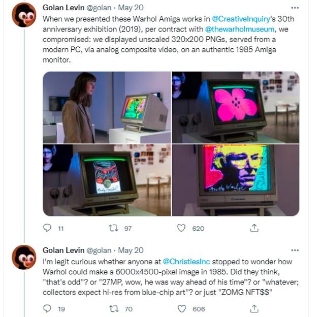 Christie's Warhol NFT is basically a fake今年五月,《Input》以“佳士得的沃霍尔NFT基本上是个赝品”为题发文,援引沃霍尔数据恢复项目(Warhol Data Recovery Project)参与者,卡内基梅隆大学Golan Levin教授在推特上的批评,指出佳士得所拍卖的是“近似的二次复制品”(2nd-generation near-copies)。佳士得的拍卖版本将原图由320x200像素不忠实的放大到了6000x4500像素,因此只能算作一种展览副本(exhibition copy)。