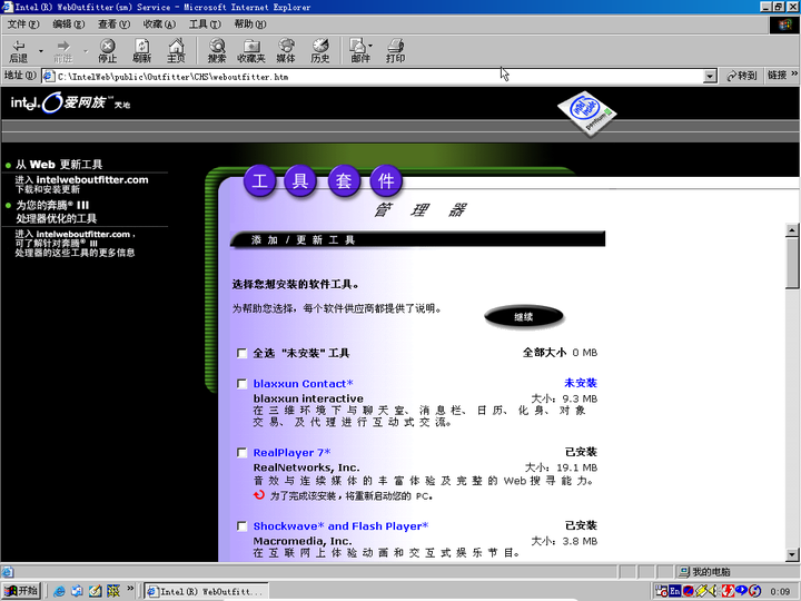 从1999年起,英特尔曾经搭配使用Pentium III处理器的电脑发售Intel Web Outfitter Tool Kit光盘,中文叫做“爱网族工具包”。这张光盘里面的主要内容就是各类浏览器插件,其中就包括了常见的Real Player、Flash Player、Shockwave等浏览器插件,也包括了支持三维图形的Superscape Viscape SVR插件,展示全景图的IPIX Player插件,以及RealSlideshow幻灯片插件等等。