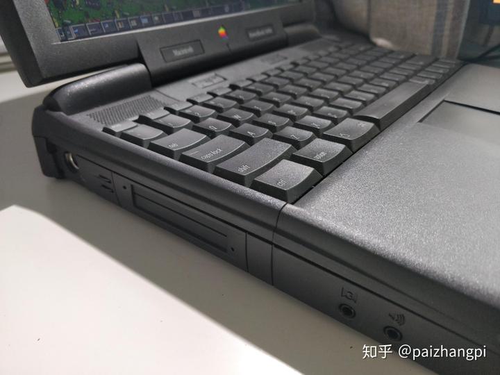 PowerBook 3400c的机身尺寸比较小巧,厚度中规中矩。屏幕上左右有两个扬声器,加上键盘左右共四个,带来大声(但音质不佳)的聆听体验。无论如何它的开机声很洪亮。又是一处历史遗留设计,你可以看到右侧的机器支架。它可以通过一个小按钮自如收放,支起整机。