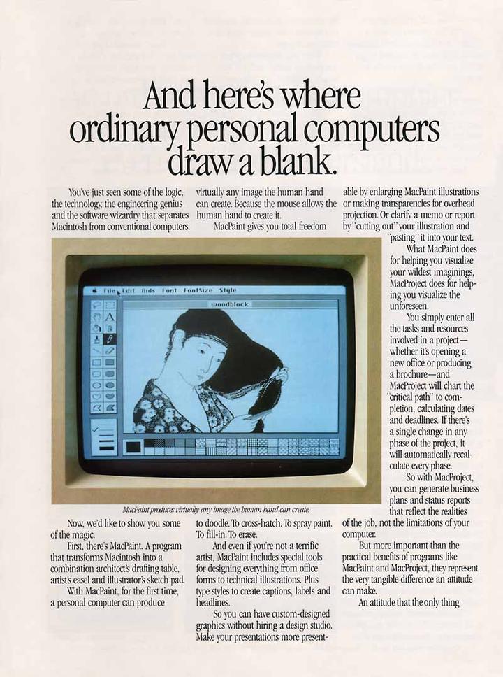 在Macintosh发布时最引人注目的软件就是MacPaint,它充分展示了苹果电脑处理位图的功能,其中最著名的画面是日本版画家桥口五叶(Hashiguchi Goyo)的作品《梳头的女人》的数字化版本,虽然它的分辨率照现在的标准并不高,但仍然能清晰的展现出服饰上的花纹和发丝的质感,在大多数家用电脑只能显示“卷轴和精灵”图像的1984年,可以实现全屏幕位图编辑的Macintosh是非常先进的。苹果设计师Susan Kare的采访讲到了这张图片制作的过程:Interview with Susan Kare