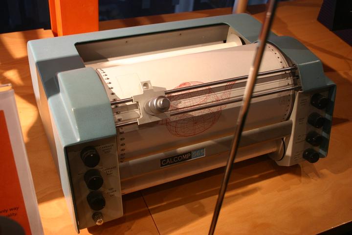 绘图仪是最早的计算机图形输出设备之一,第一款商品化的电脑绘图仪是1959年的Calcomp 565滚筒式绘图仪,它的滚筒可以带动纸张做垂直移动,而笔尖则在横杆上做水平移动,以此在二维平面上定位笔尖并完成绘图。