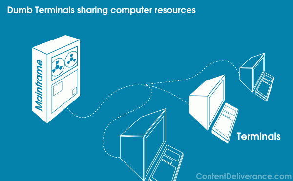 当时的大型计算机往往是若干个大机柜,一个机柜是CPU,一个机柜是磁带机,一个机柜是硬盘。有些时候甚至CPU和内存都是不同的机柜。电脑的使用者通常并不能直接接触到电脑主机,也不能独占电脑资源,而是需要和很多人共享计算机资源。分时系统(time-sharing)的出现让多个用户可以同时操作同一台计算机,每一个用户独占一套输入输出设备,但CPU和内存资源是分享的。这套服务于单个用户输入输出设备通常是一台电传打字机、或者是后面提到的视频显示型终端机,这样的设备在整个电脑系统里是触角的末端,也因此被称作终端。