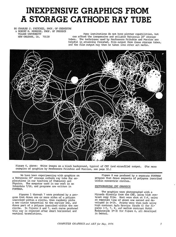 在1976年5月份的《计算机图形与艺术》(Computer Graphics and Art)杂志上,杜兰大学(Tulane University)的化学教授Charles J Fritchie发文介绍了使用存储式阴极射线管作为廉价的计算机图形设备的尝试。