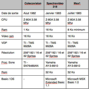 MSX平台的原型主要参考的是Spectravideo发布于1983年的的SV-328电脑,而SV-328电脑的硬件规格则很大程度上参考了ColecoVision游戏机,由于出现的较晚,它使用了许多已经在市面上广泛使用的电脑芯片其中就包括了,与TRS-80相同的Zilog Z80处理器,和与TI99系列相同的德州仪器TMS9918/9928图像芯片,以及在许多家用电脑种都使用的AY3-8910声音芯片。