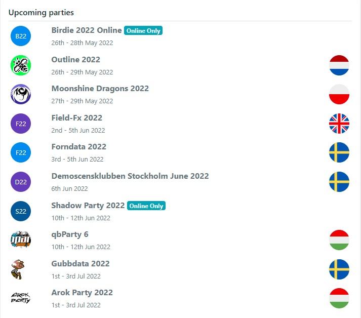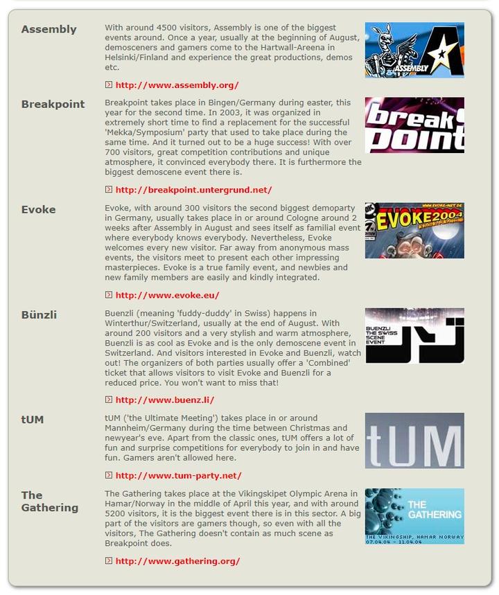 能够使用Scene ID通行的网站中,除了刚才提到的http://Pouet.net,还有一个比较重要的网站就是http://demoparty.net,它是专门收集世界各地演示聚会信息的网站。如果想有机会近距离接触演示场景社群的话,最好的办法就是去到演示聚会的现场,而http://demoparty.net就是帮助人们找到他们想要参加的聚会的网站。