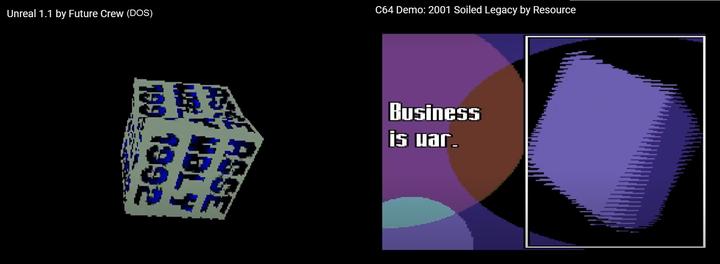 我们会发现Commodore 64上的Demo和DOS demo有一些类似的地方,比如旋转的立方体,横穿屏幕的光条横幅等等。但我们也能看到一些Commodore 64与PC不同的特有风格,因为它是一款8-bit的机型,所以能看到典型的八位平台上像素化的画面和低色彩的调色盘。其音乐风格也与老式游戏机相仿。而DOS运行在16位的X86平台上,就会有更丰富的色彩和录音采样构成的音乐等展现16位电脑功能的元素。而面向当代电脑的demo则会展现绚丽的真彩色图形和3D效果。这些都体现出计算机的硬件的性能与演示程序的表现风格之间的紧密联系。
