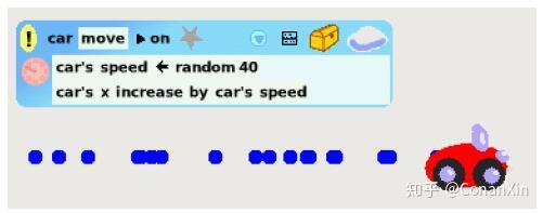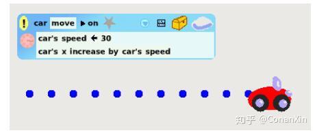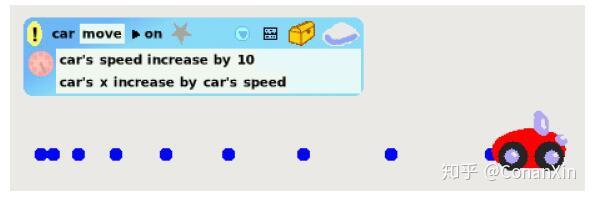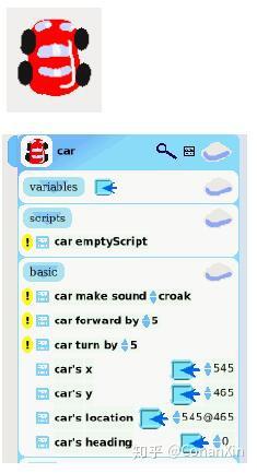 到目前为止,这只是一张图片。但之后他们可以“深入”他们的画,查看它的属性(例如汽车的位置和方向)和行为(朝着它的方向前进的能力,或通过转弯改变它的方向的能力)。这些行为可以被拉出来放到“世界”上,制作一个脚本,点击时钟就可以设置“滴答”。汽车开始按照剧本行驶。如果我们把汽车的笔放在世界上,它会留下一条轨迹(在这种情况下是一个圆圈),我们看到这是伪装的帕尔特的logo龟,一只穿着制服的乌龟,用简单的方法查看和控制它。