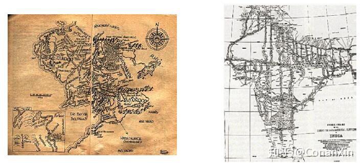 右边是19世纪英国测量师精心制作的印度地图。左边的是托金(Tokein)的“中土世界”,幻想中的《指环王》就是在这里发生的。