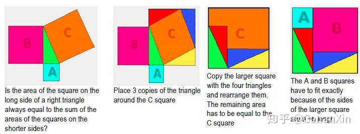 我们可以用三个以上的三角形围绕C正方形来制作一个更大的正方形,其面积是C正方形加上4个三角形。我们复制并移动三角形。这个奇怪形状的橙色区域仍然是C方形区域。我们看到我们可以移动A和B方块来精确覆盖这个区域。成功了!