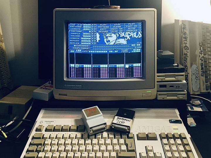 1987年推出的Amiga 500价格更加便宜,推出时的售价仅售699美元或499英镑,这让它在欧洲颇为流行,Amiga电脑的标准配置带有音频输出接口,但不具备音频采样和录制功能。为了更好的利用Amiga电脑的音频功能,一系列专门为Amiga电脑设计的音频采样外设被开发出来,它们通常是连接在Amiga电脑打印机接口上的小盒子,可以将外部输入的模拟音频信号转换为可以在软件中处理的数字音频信号。在1980年代末,一套由Amiga电脑和采样扩展卡为核心的家庭录音设备花费不超过1000英镑。