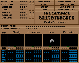 Obarski simplified the interface of SoundMonitor, losing some of the complexity of the C64 program by bringing all four of the Amiga's four channels together into a single editable 64-step grid called a pattern. Each pattern displays the four channels as vertically scrolling columns of cells, headed Melody, Accompany, Bass, and Percussions, with a horizontal time bar that stretches across all four tracks to show the current play position. These patterns give a simple overview of the order and structure of the music, something like a musical spreadsheet, and can be sequenced and arranged in different ways to produce a song.