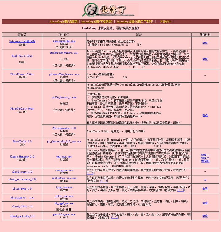 另外,在国内软件传播路径中,汉化者起到了非常重要的作用。而3DS Max、Photoshop、Authorware、Flash等多媒体软件的汉化者,很可能也是国内最早一批数字媒体相关领域的开发者。叶利奥的计算艺术网站中有一个名为“滤镜汉化室”的网站,从它的名字就看出它专注于各种多媒体软件的滤镜,而几乎所有软件的汉化补丁都提供了对应的注册码或注册机。