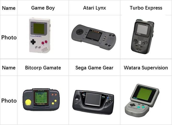 | Game Boy | Atari Lynx | Gamate | Turbo Express | Game Gear | Watara Supervision | |
