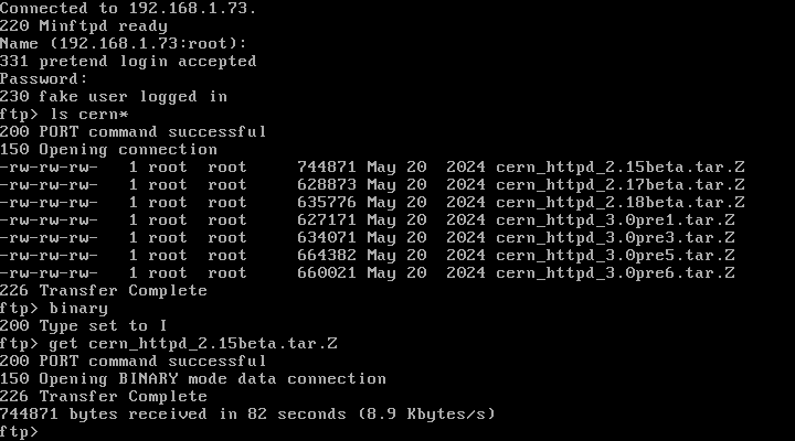 Telnet不用多说,在今天,加密的SSH取代了它的地位,FTP文件传输协议则是当时最重要的Internet服务——当时的Linux本身在互联网上就是依靠FTP传播的。SLS中的FTP跟FileZilla这样的现代FTP客户端连接会有些问题,但Windows下的FTP命令是没问题的,关于FTP命令的用法,可以参考:CMD中FTP命令大全_cmd ftp命令-CSDN博客