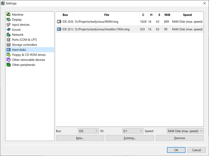 由于上面第2点,我为从硬盘安装创建了两个磁盘镜像,一个900M用来模拟1GB储存卡,一个100M用来作系统安装源,由于上面的第4点,硬盘需要配置为0:0和0:1,即Primary Master/Slave。