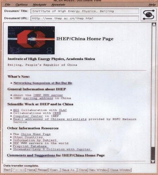 这是早期的IHEP网站唯一一张截图,从图中我们可以很容易看出,使用的浏览器的NCSA Mosaic,而熟悉早期Linux的朋友们可能能辨识出它使用的窗口管理器是FVWM。