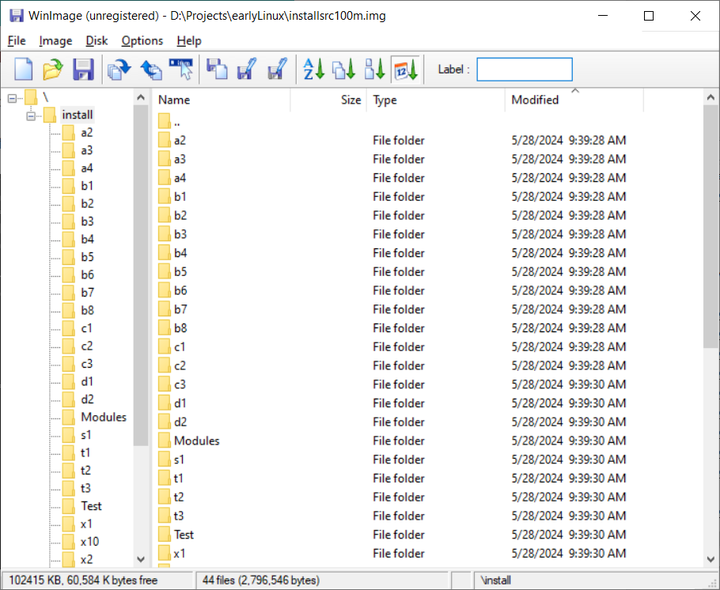 其中的文件名都是符合DOS 8.3格式的,因此不用担心它在Windows上解压的问题,压缩包中a1.3,a1.5是3.5寸和5.25寸启动盘的镜像,将扩展名改为.img就可以在大部分虚拟机加载;而以a/b/c/d/s/t/x等编号的文件夹是为软盘安装组织的,每个文件夹对应一张软盘。