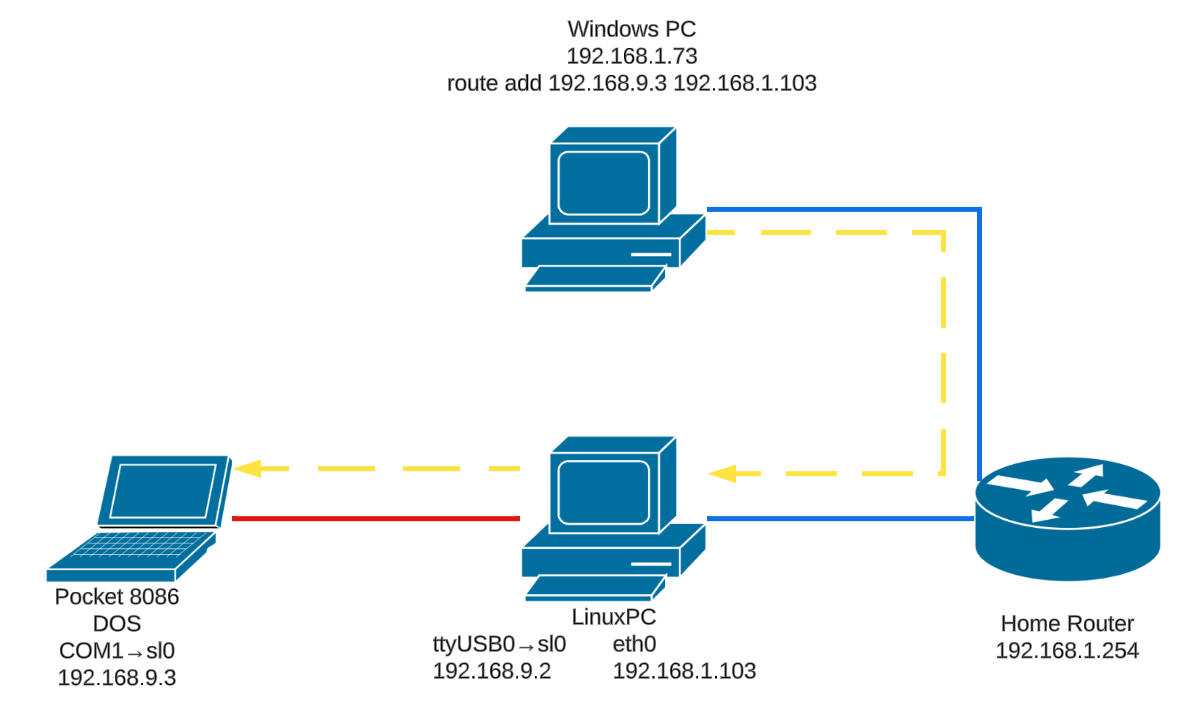 我的家庭网络状况如图所示,路由器和Linux PC使用以太网连接,都在192.168.1.0/24子网里,Linux PC使用USB串口适配器和Null-modem线连接到Pocket 8086 DOS主机。