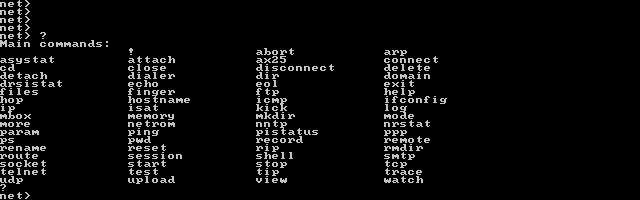 在DOS电脑下启动KA9Q比较只要执行net.exe就可以看到KA9Q的net>提示符,输入问号回车,就可以看到它支持的命令列表。