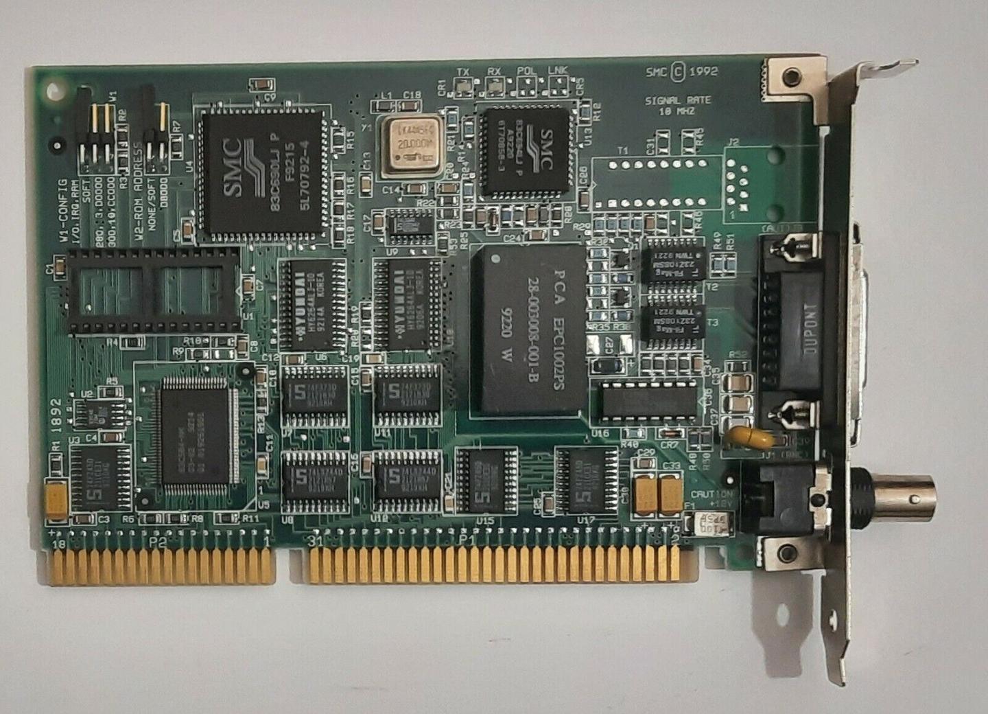 如果你的电脑正在使用XT-IDE硬盘适配卡,包括Book 8088、Pocket 8086集成的XT-IDE支持,使用ISA网卡的时候要注意避开被占用的I/O地址300,如上图中的SMC网卡,就应当使用跳线选择I/O 280+IRQ 3的组合,而无法使用I/O 300+IRQ 10的组合。下面是一个启动IO 320+IRQ 5的NE2000兼容型非即插即用网卡Packet驱动的例子: