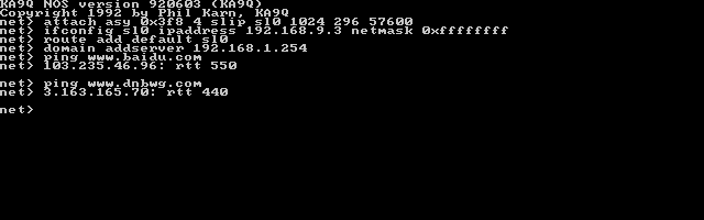 route add default sl0最后,我们把本地局域网的DNS服务器(通常是家用路由器的IP)添加到KA9Q里