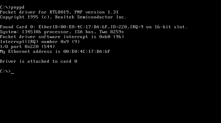 如果你的DOS电脑是比较新的型号,BIOS是1995年之后的版本,它们通常可以支持ISA PnP,或者你使用的本来就是PCI插槽的网卡,Packet驱动的启动就很容易,以RTL8019芯片为例,只要执行