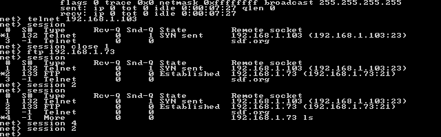 KA9Q支持多线程功能,可以同时保持和多个服务器的连接,当连接到一个服务器时,按F10键可以跳回net>提示符,然后建立下一个连接,在net>提示符下,还可以使用session命令查看活跃的连接,或是使用session+线程号切回特定的线程。