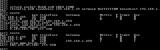 attach packet 0x60 en0 1024 1500packet是指驱动的类型,而后面的0x60分别是网卡驱动的中断号,端口名称,缓存和MTU,对于以太网来说,MTU通常默认为1500 然后根据局域网的设置,为DOS主机分配一个静态IP地址: