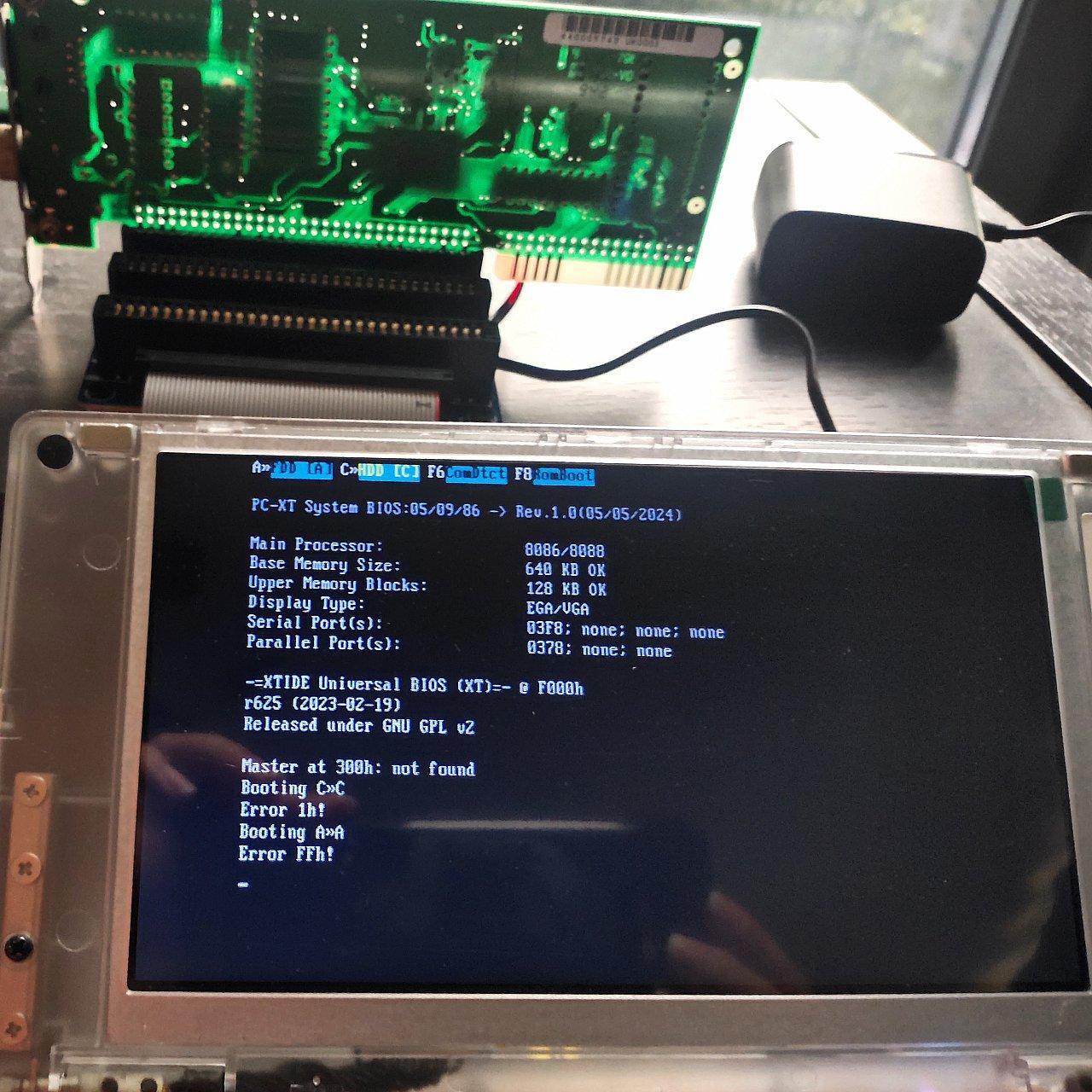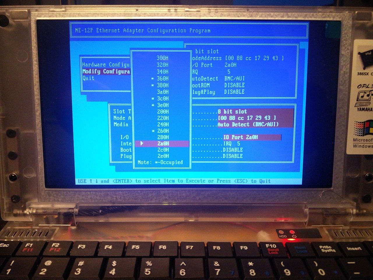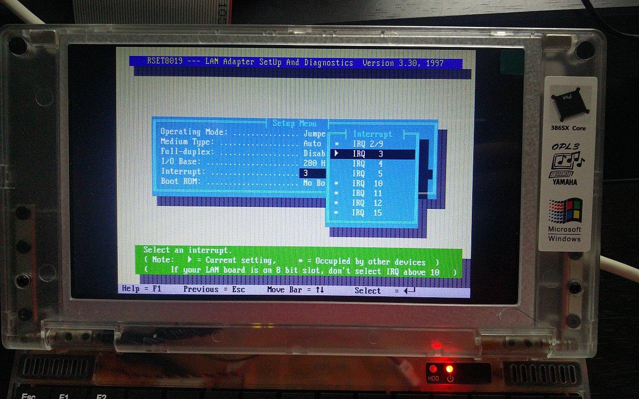 I/O端口地址的配置对于Book8088和Pocket 8086来说更加重要,因为这两款机器的XT-IDE硬盘控制器的默认地址是0x300,与大多数NE2000网卡默认地址冲突。由于Book 8088和Pocket 8086的XT-IDE固件是集成在主板固件中的,因此没有简便的修改办法。这个问题在Book 8088中通常并不影响开机,但Pocket 8086中会导致XT-IDE硬盘无法被识别而无法正常使用。
