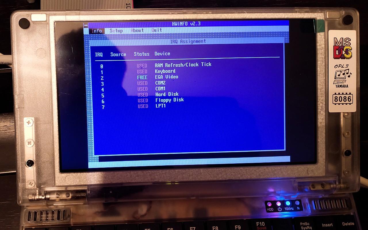 如果不确定IRQ是否被占用,可以尝试使用DOS版HWiNFO工具(如果是286之前的电脑需要使用压缩包中纯16位的hwinfo16.exe)的“IRQ Assignment”功能查看。但需要注意的是,根据主板的不同,HWiNFO的报告未必准确,比如Pocket 8086中并没有COM2、硬盘、软驱,但HWiNFO却报告被占用。