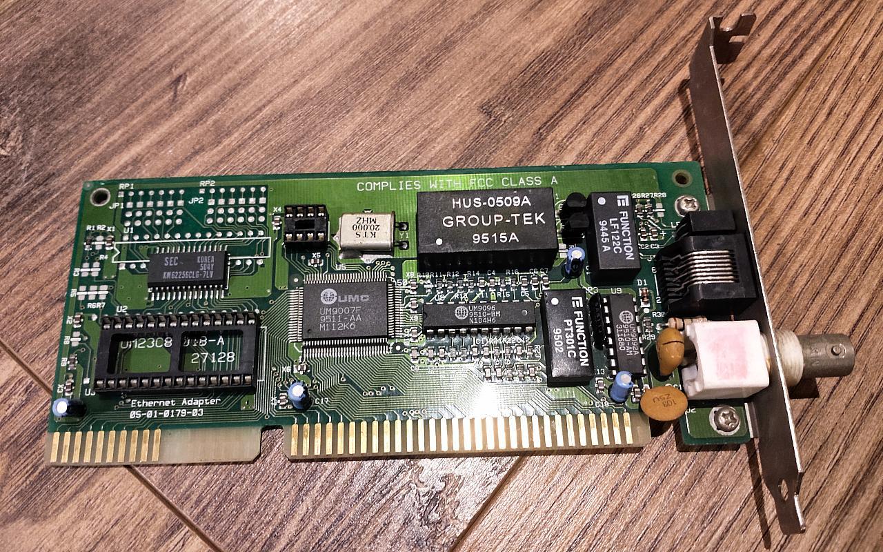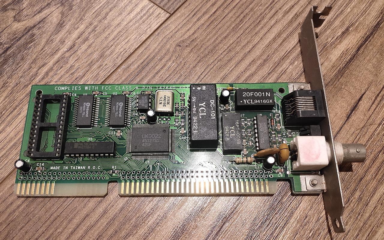 本文展示的第一块网卡是瑞昱(Realtek)的RTL8019,这是市面上最常见、文档最成熟的NE2000兼容网卡。RTL8019在90年代就由于其低廉的价格大受欢迎,其后续产品RTL8029(支持PCI插槽)、RTL8139(支持100Mbps)也都有着巨大的装机量。RTL8019也是复古计算社区中广受欢迎的网卡芯片,爱好者们设计了不止一款开源PCB方案用于生产新的RTL8019 ISA网卡。