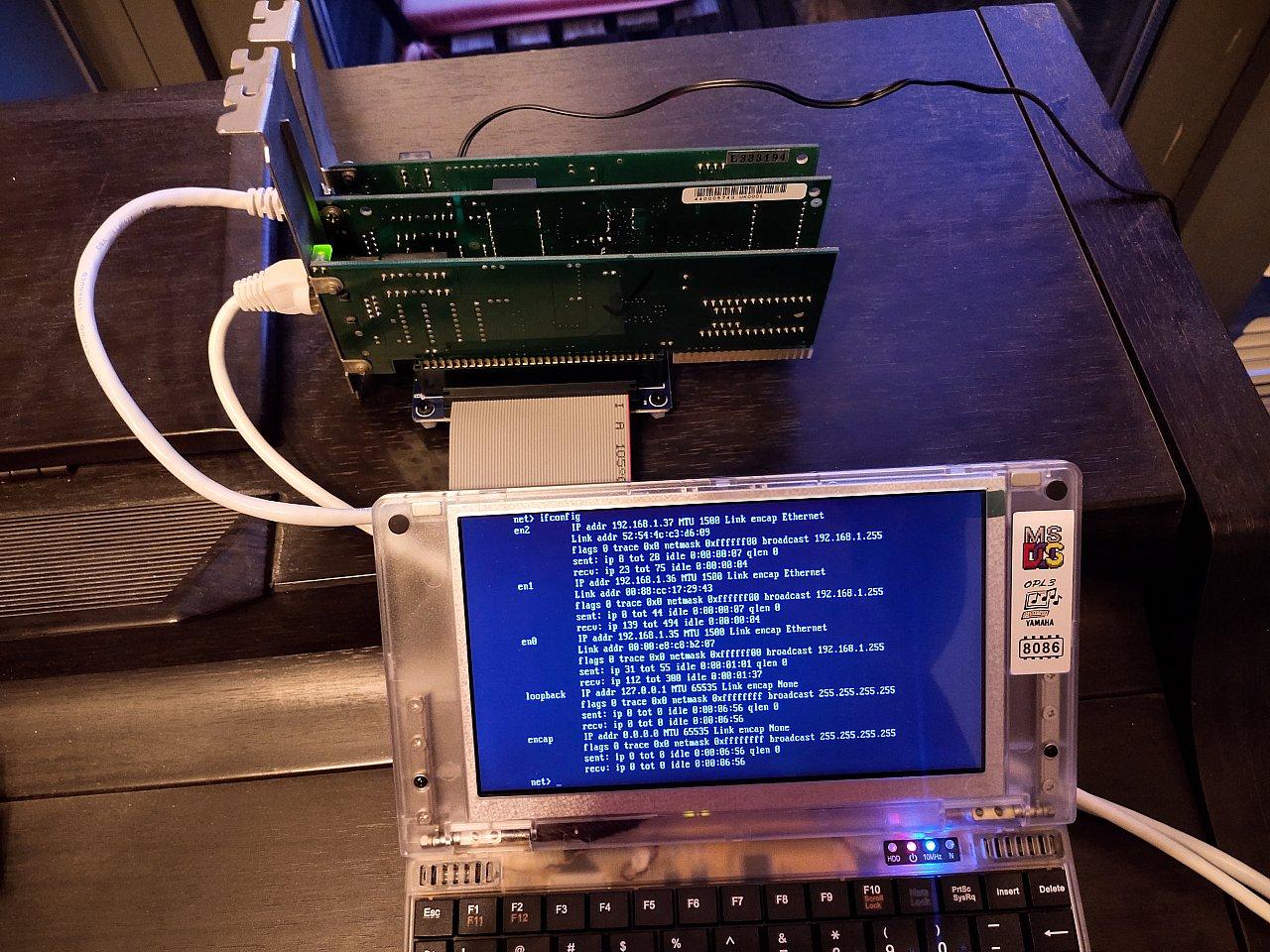 虽然DOS作为主要为单机、单用户环境设计的操作系统,其网络功能受到诸多限制,但KA9Q、LANtastic等运行在DOS上的网络操作系统仍然提供了使用多接口的能力。我们只需要将网卡分配在不同的IRQ和I/O地址资源上,并避免使用IRQ冲突的设备,就可以同时使用多个网卡。例如我自己就让三块网卡同时工作在Pocket 8086上。其资源分配和驱动加载命令如下: