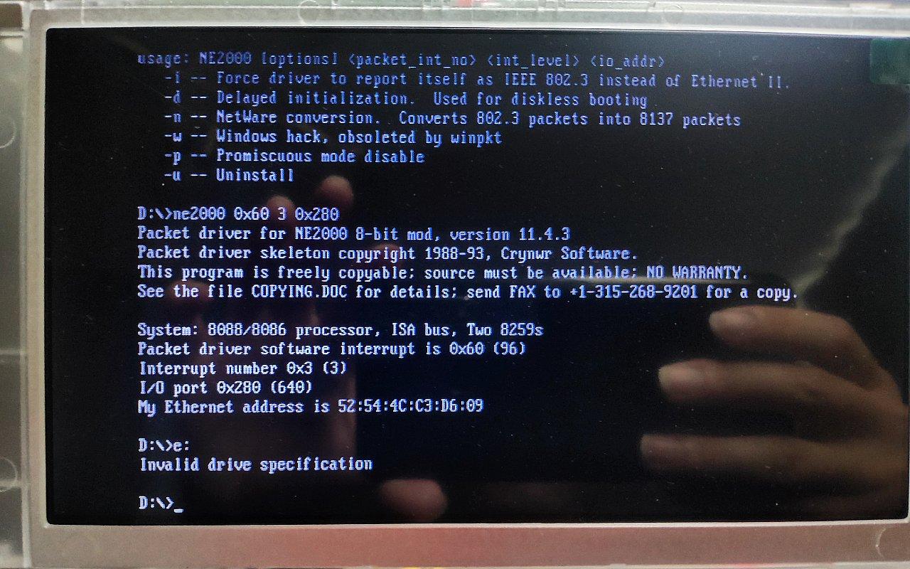 在我的测试中,使用NE2000 8-bit ISA修改版Packet驱动,可以在Pocket 386、Book 8088和Pocket 8086上使用所有NE2000兼容网卡,比如我们已知某块网卡的IRQ是3,I/O地址是0x280,就可以用