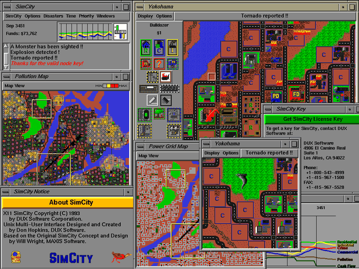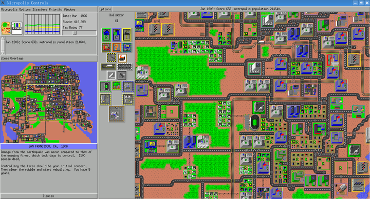 我尝试移植的第二个游戏是模拟城市,SimCity的Linux版本的历史可以追溯到1993年发布的X11 TCL/Tk版模拟城市,当时这款游戏主要面对的是Sun、SGI等商业Unix工作站用户。