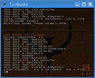 thandor.net - benchmark - Quake我们尝试在龙芯一体机下运行类似的测试,在文件夹中执行,使用320x200窗口模式运行TyrQuake(龙芯一体机的SM501显卡不支持全屏运行在不同分辨率下,会黑屏,如果遇到类似的情况,需要使用Ctrl+Alt+Backspace重启XWindow)